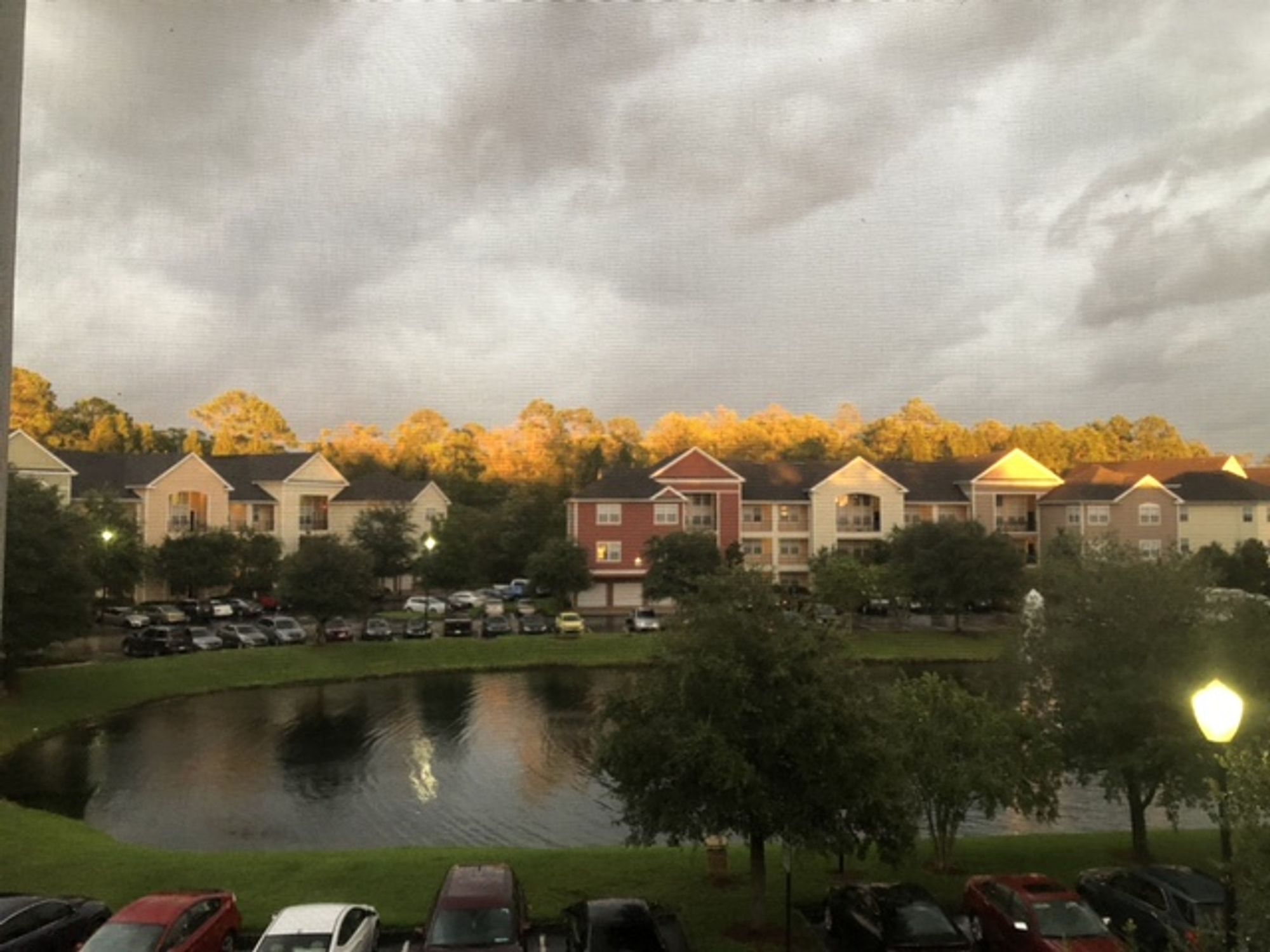 The sky down here is always doing wonderful things with light. In the spring and summer especially, I’m in near-constant awe. In this picture, I came outside just as the sun was setting on these trees, imitating fire. I love this mix of beauty and danger, plus we see the ubiquitous retention pond, featured throughout the book.