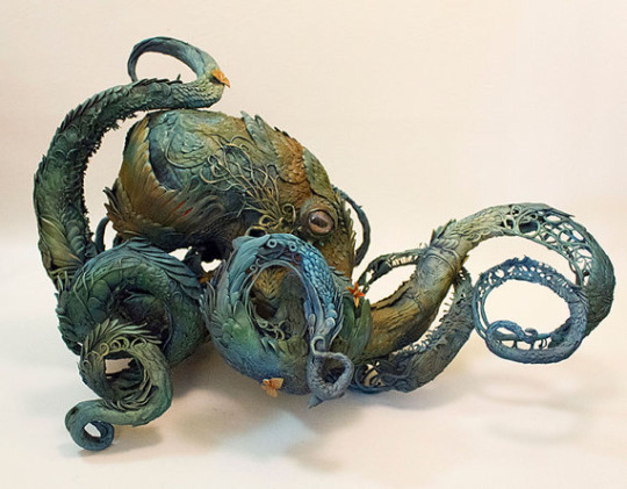 A sculpture by the Canadian artist Ellen Jewett, who made a series of animals and figures out of clay, polymers, and glass. I came across this image on Tumblr in 2015, after I’d begun drafting the story that would become “Feast,” and it seemed like a sign. This sculpture also became the inspiration for my octopus tattoo, Faye.