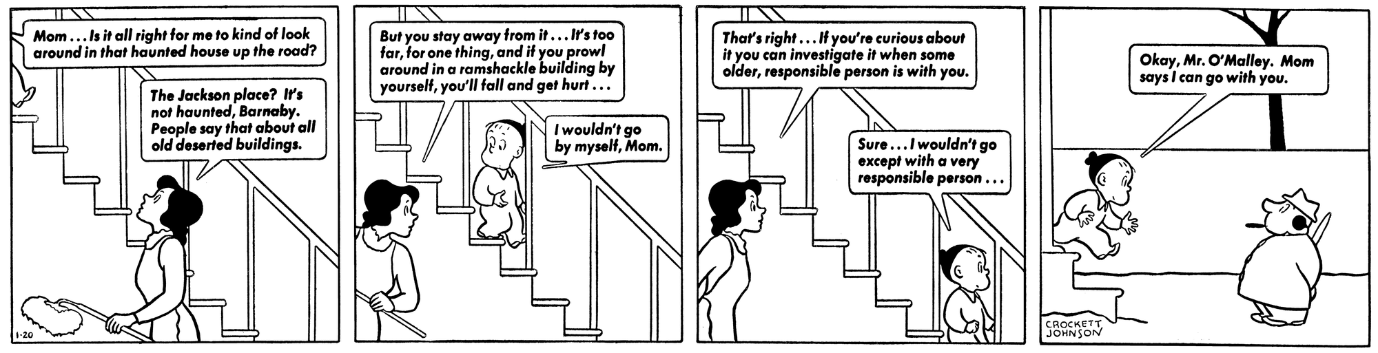 Like Peanuts, few Barnaby strips offer much visual depth or distant scenery, and movement occurs on a two-dimensional plane. Dialogue also resides on the surface of the panel and is activated visually by its italics, which keeps the lettering from corresponding too fully with the vertical and horizontal lines that make up the interiors and exteriors of Barnabyâs world. This subtle differentiation is on view in the strip from January 20th, 1943, in which Barnabyâs mother speaks to him as he descends the stairs in their house. Three panels maintain the same view of the staircase running from the upper left to the lower right. The steps bisect each panel in a uniform zigzag, punctuated at regular intervals by the rail posts. The handrail connects the tops of the posts and completes the orderly geometry of the staircase by closing off each section between the posts to form symmetrical, repeating planes.