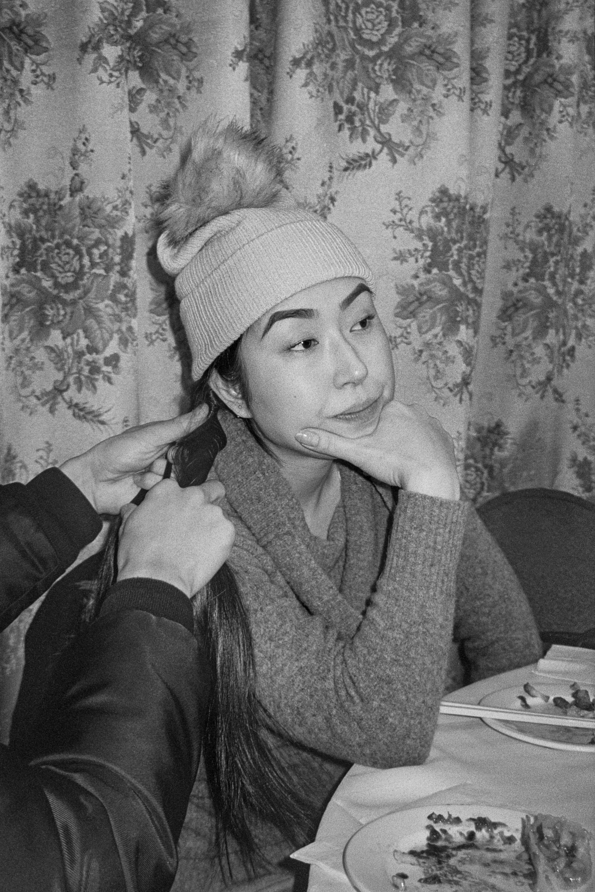 A woman looks away from the camera. Her long, dark hair is held in two hands, probably those of a man. He may be stroking or braiding it. The photograph is in black and white, enunciated by the dark hair and white hat. The woman wears a white, knitted cloche, at its top a fluffy ball. Maybe a faux bit of fur. The cloche covers or disguises much of her forehead, maybe it’s a high one. Her chin rests on her hand, which forms a V-shape, and it covers her chin. The V of her hand exaggerates the upward tilt of her lips, and, like arches, her V-like eyebrows frame her eyes. Floral wallpaper hangs behind her.