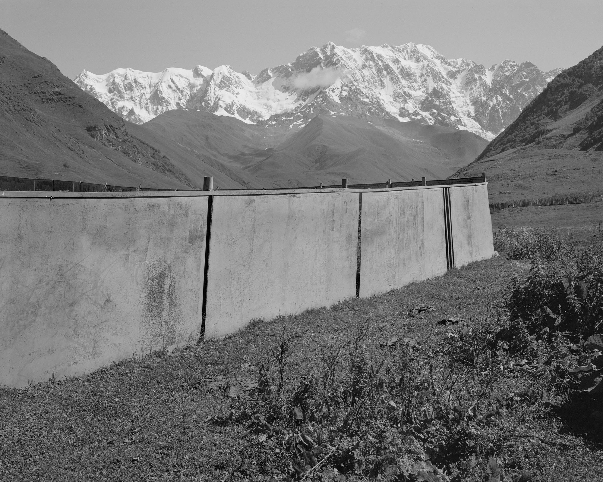 A wall of concrete divides a landscape. It appears to be in four sections, and juts out diagonally from the left of the frame almost to the frame on the right side. Its placement is curious. In the background, a snow-capped mountain stretches horizontally across the top of the picture. It also doesn’t reach either side, cut from the edges of the picture by two black mounds. The mounds on either side define the space of the wall and the snow-capped mountain. Formally arresting, and not only that, I find myself stopped by it.