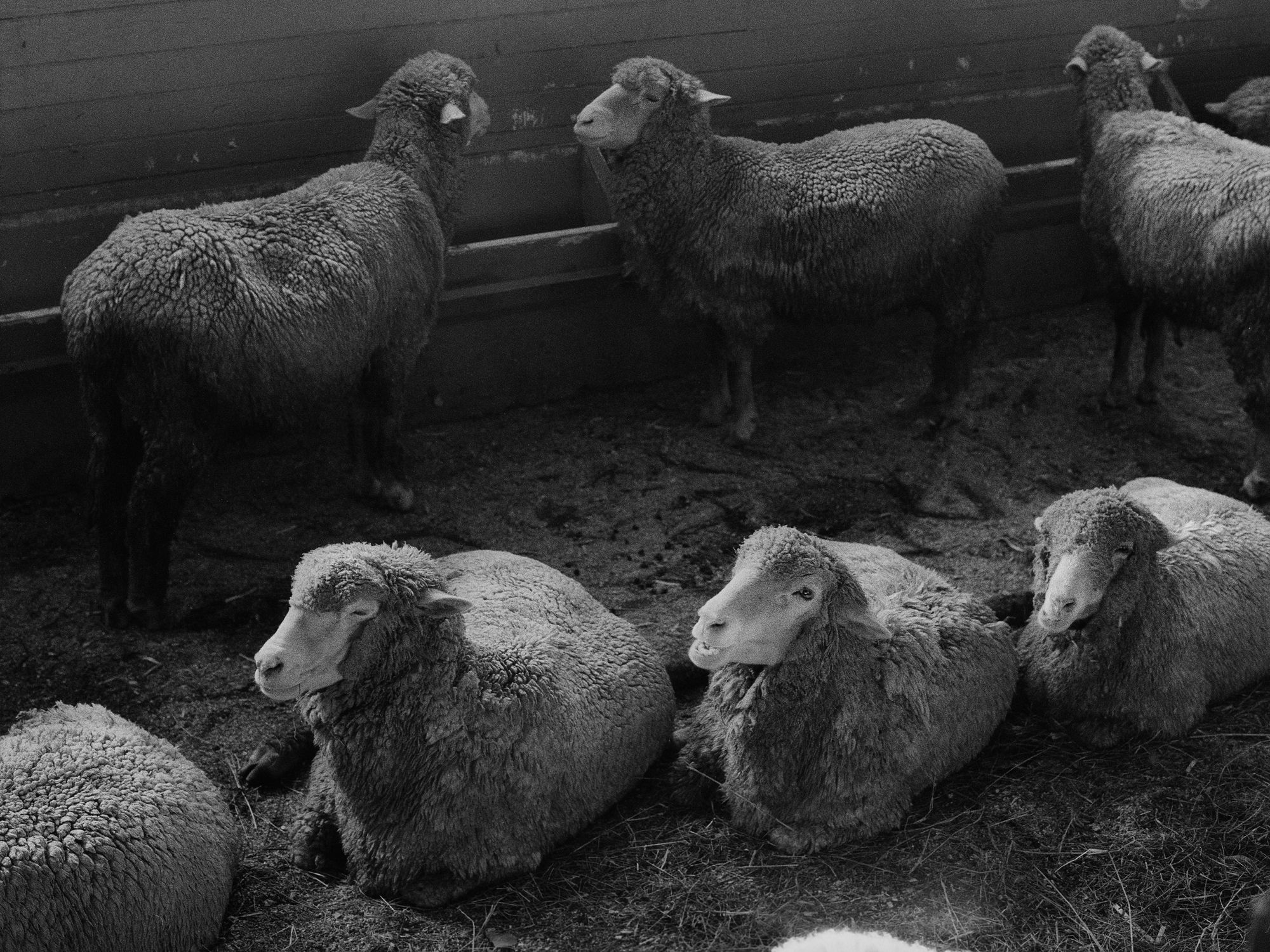 In black and white, it’s a somber composition. Sheep are not usually somber subjects—on Google, there are millions of roly poly sheep and sweet baby lambs. Kim’s picture is striking in its profound sense of stillness: they’re lifeless sheep. The photograph’s affect is impersonal, the sheep lack personality, and especially with darkness surrounding them, it’s a melancholy picture.