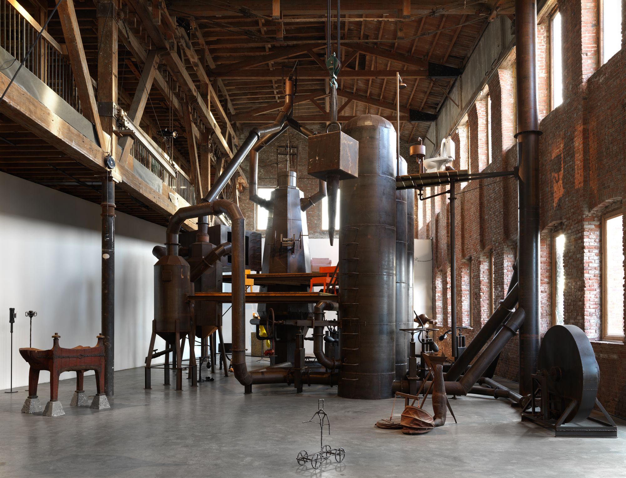 For his largest-scale exhibition in the United States, The CryptoFuturist and The New Tribal Labyrinth, AVL draws from two bodies of work that give the exhibition its name. They transform Pioneer Works into an immersive installation of sculptures and industrial machines. Central to the New Tribal Labyrinth series is Blast Furnace (2013), an imposing structure referencing Industrial Revolution-era furnaces traditionally used to produce steel. The sculpture also contains domestic elements such as a kitchen, toilet, and sleeping quarters. This environment is inhabited by an imaginary tribe of metalworkers, a “new tribe” with a visceral desire to return to the beginning of industry—the origins of Western culture, wealth, materials, and products. This tribe feeds off the heat, waste, and noise of their industrial utopia, setting the stage for the synthesis of human and machine. Some of the works in the New Tribal Labyrinth series express this synthesis through sculptural representations of sperm and reproductive organs doubling as lamps and furniture. They posit the human body as itself a kind of machine, endlessly procreating.