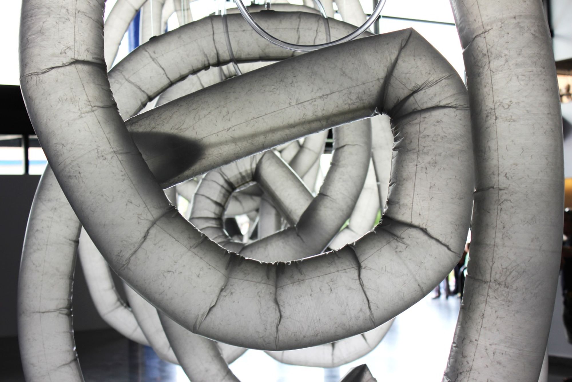 Organic Arches II is a site-specific installation consisting of a progression of inflatable arches in different sizes that undergo an organic metamorphosis several times a day. Suspended from the ceiling and barely touching the floor, these hand formed arches are levitating and inhabiting the space with their weightlessness. Their diaphanous skin, a specifically designed high tensile fabric with a built-in memory, absorbs the daylight and offers a view into their inner workings.