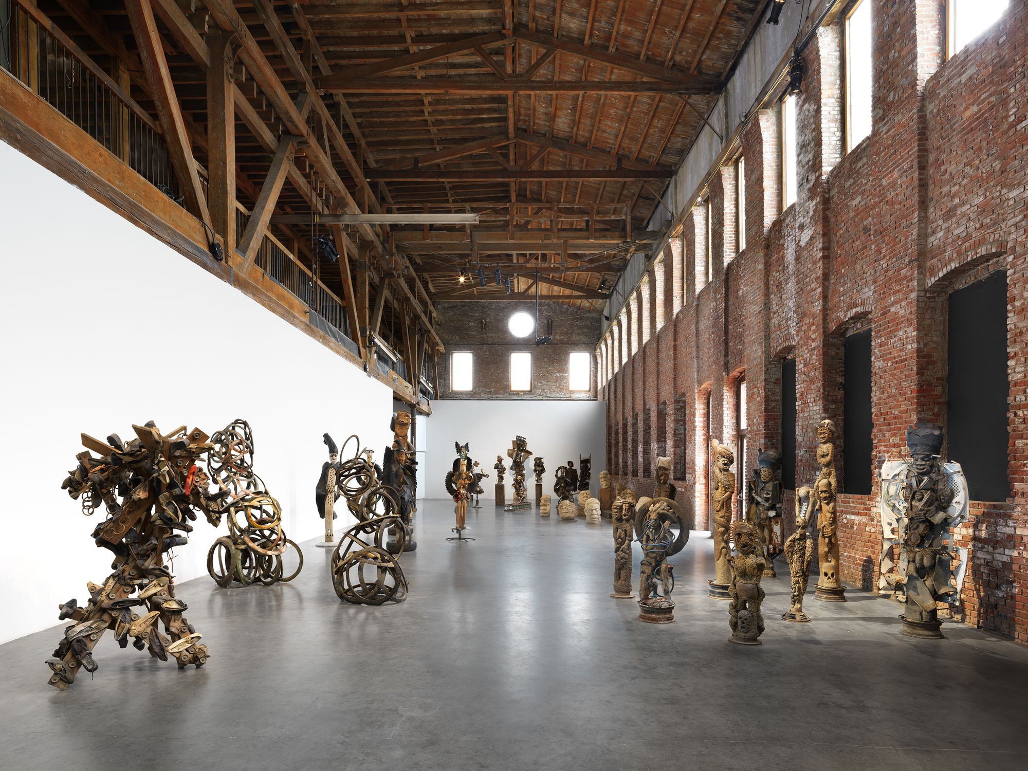 The first floor exhibition presents a diverse group of sculptures including sequined Vodou flags, stone and wood carvings, and found object assemblages, most of which have never before been seen in the United States. The sculptural installation mirrors the organization of the city itself by highlighting specific districts in Port-au-Prince where art is produced—each with its own particular subjects, forms, and materials. The neighborhood of Bel Air, situated on a hill that rises behind the remains of the Catholic Cathedral in downtown Port-au- Prince, has a rich concentration of Vodou flag artists and sequin sculptors—a tradition alleged to have originated from the royal flags and banners of Benin. Rivière Froide is a community of sculptors living on the banks of the river that passes through the city’s Carrefour neighborhood, who carve their work from limestone and other detritus found at the water’s edge. At the southern end of Grand Rue, the main avenue that runs north to south through downtown Port-au-Prince, is a close-knit community sited in the area that has traditionally produced small handicrafts for the ever-diminishing tourism market. Taking readymade and recycled materials from the makeshift car repair district nearby, the Grand Rue artists make assemblages that transform the detritus of the world’s failing economies into apocalyptic images. Sculptors include Katelyne Alexis, Karim Bléus, Jean Hérard Céleur, Myrlande Constant, Lhérisson Dubréus, Ronald Edmond, André Eugène, Guyodo (Frantz Jacques), Ti Pelin (Jean Salomon Horace), Evel Romain, and Yves Telemaque.